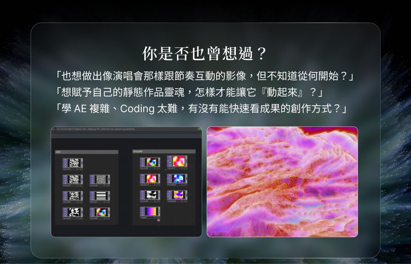 ![[工作坊] TouchDesigner 零基礎實戰班|創作到初次舞台演出實戰](https://s.teachifycdn.com/image/width=660,quality=80/course/cover_photo/92c518a0-93ea-4661-9fed-b6ad32346956/d57e0294-5f30-4f57-8cb8-d15dbcdf0026.jpg)