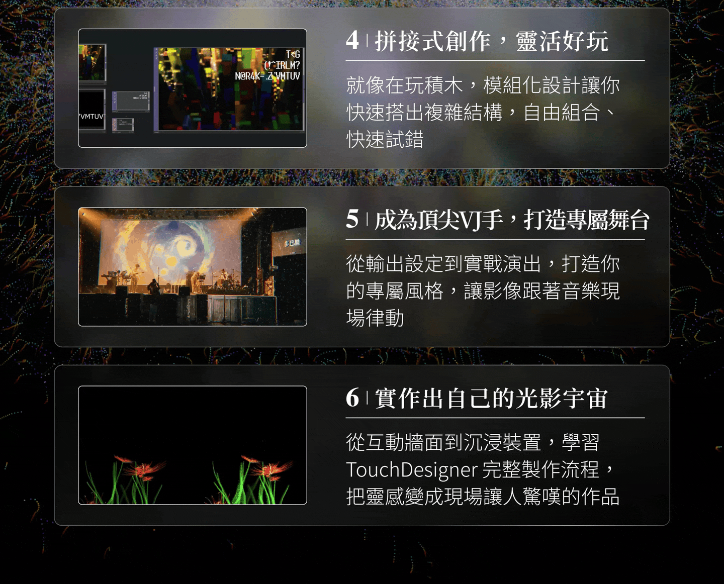 從 0 開始,無需程式經驗|7 小時完成能上台演出的互動創作|專為新手打造的體驗型實戰課程,最直覺的創作,所見即所得!課程最後直接連接舞台設備,現場發表你的作品,感受真實演出效果!